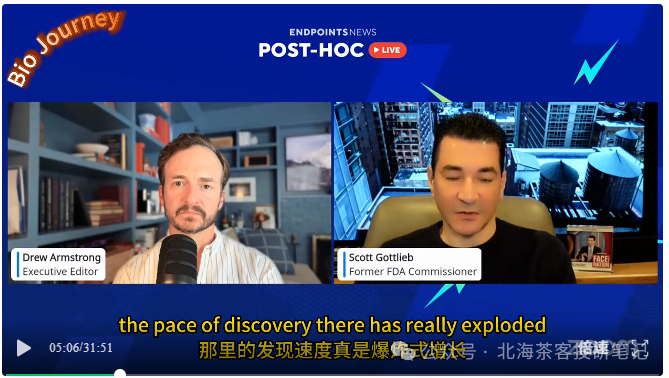 第一,Gottlieb说,世道完全变了,以前我们美国还在质疑中国药物临床的真实性,现在这根本不重要了,因为中国药企通过和国际大药厂合作,关键的后期临床试验大多是由国际大药企来推动,这种商业模式的转变使得中美合作的核心障碍被解决了。 美国公司现在引进的都是早期资产,决定药物能否上市的关键性临床研究(pivotal studies)会在美国和欧洲进行 。在决定是否引进一个I/II期资产时,企业更关注的是药物是否展现出生物学活性(biological activity),而非最终的临床疗效数据。 而在早期的药物发现中,中国企业的效率和临床密度实在是太高了。以至于Gottlieb说,现在美国的VC在投资一家初创公司时,他们首先会去检索中国是否有同类竞品。如果发现中国已经有三四个类似的项目,他们很可能会因此放弃投资 。 这其实是中国大部分产业走出的路,听上去并不高级: 走别人的路,让别人无路可走。 第二,Gottlieb说,中国的药物发现(discovery)能力在过去5-6年里“真正地爆炸了” 。创新不再局限于传统的小分子“me-too”药物,而是扩展到了双特异性抗体、细胞疗法、基因疗法等尖端领域,甚至在某些方面“超越了美国的技术”。 而接下来的这句话如果从一般人说出来显得轻飘飘,但从这位曾经能有上帝视角审视全球创新药发展的FDA官员中说出来就显得更有份量: 绝不能将中国的崛起视为一个短暂的“套利窗口”,这是一个“永久性的颠覆” (permanently disruptive)。 第三,面对这一强有力的竞争者,他给美国的“药方”并非保守的保护主义,而是积极的自我革新——通过提升内部监管效率,重新点燃美国生物医药生态系统的核心竞争力。 我不想过多吹嘘中国创新药有什么花样,无它但手速耳: