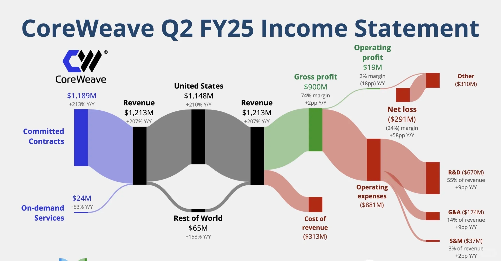这两年 CRWV 的营收增长堪称 “教科书级”:2023 年才 2.29 亿美元,2024 年直接飙到 19.15 亿美元,同比暴涨 736.6%;2025 年更狠,光第二季度就赚了 12.1 亿美元,上半年总营收 21.94 亿美元,同比增速高达 275.68%。