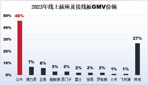 截至2023年,公牛线上插座及接线板销售额占比达到了46%,而同期小米的销售额占比仅为1%。至此,公牛已在这场插座之争中大获全胜。