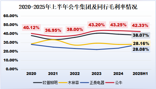 2020年至2024年,公牛集团毛利率基本保持在40%左右,2025年上半年实现新高42.33%,远超同行木林森、欧普照明、正泰电器。
