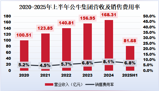 从公司近几年的营收情况来看,这个策略相当正确。2020年至2024年,公牛营收从100.51亿元攀升至168.31亿元,相当于从月入8亿变成了月入14亿;而同期公司平均销售费用率仅为6.1%,基本没出现较大波动。