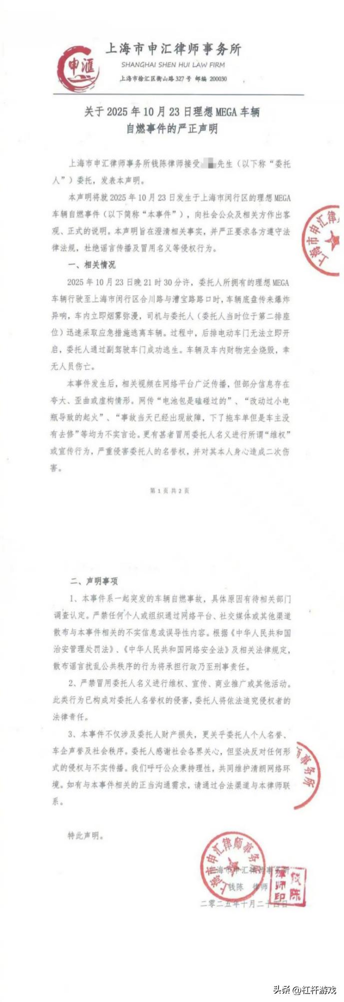 反转还在继续,理想回应之后车主po出声明,称“过程中,后排电动车门无法立即开启,委托人通过副驾驶车门成功逃生。车辆及车内财物完全烧毁,幸无人员伤亡。”