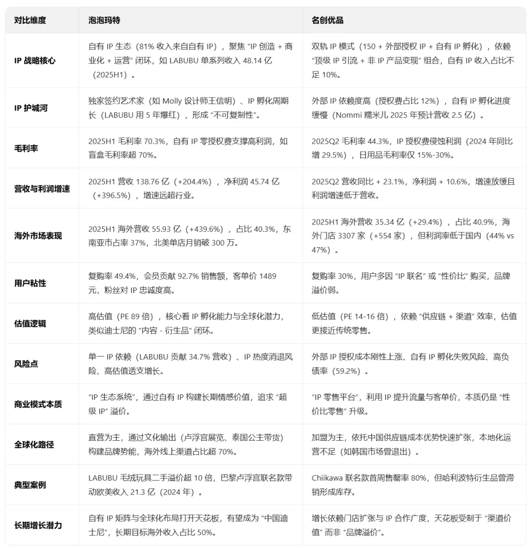 名创优品 “轻 IP 资产”(授权为主)现金流更稳,但长期壁垒依赖合作稳定性;泡泡玛特 “重 IP 资产”(自有为主)壁垒更深,但孵化失败风险更高 —— 类似比亚迪 “自研电池” 与 “外采电池” 的估值差异,核心是 “资产控制权” 的定价。