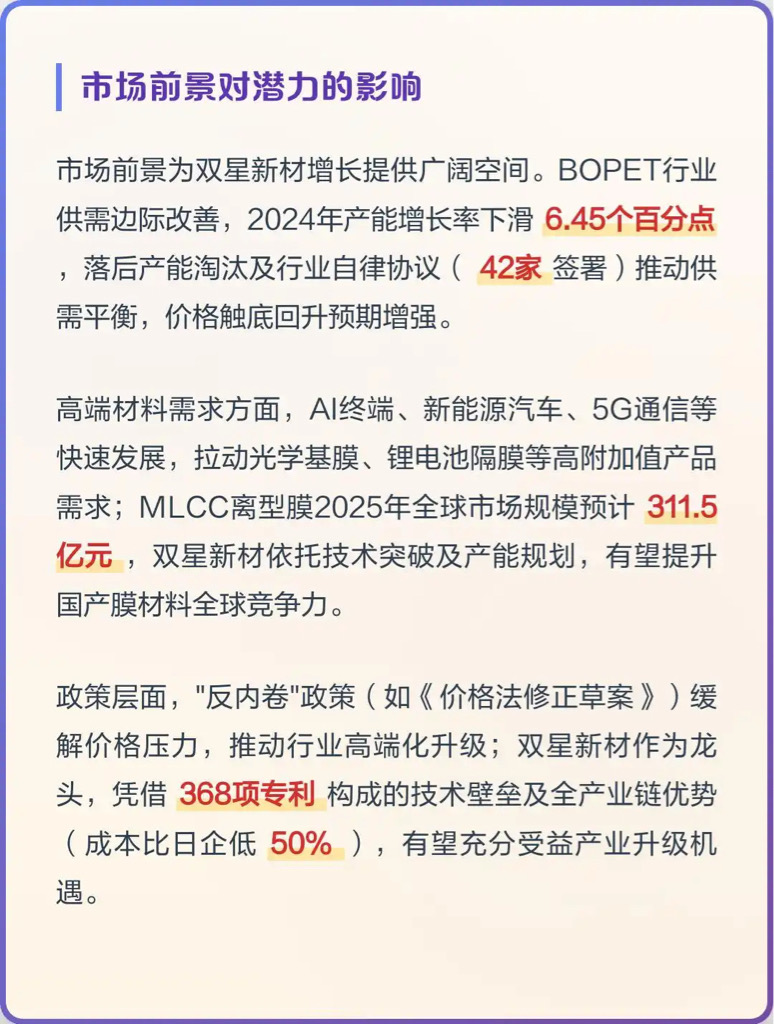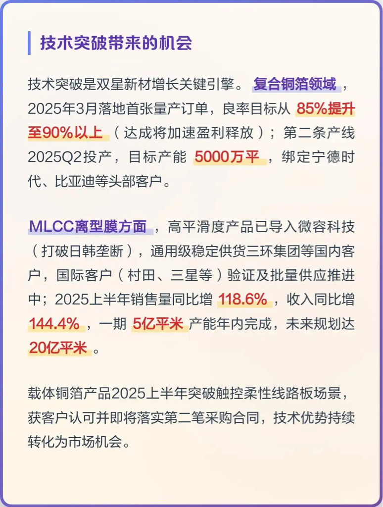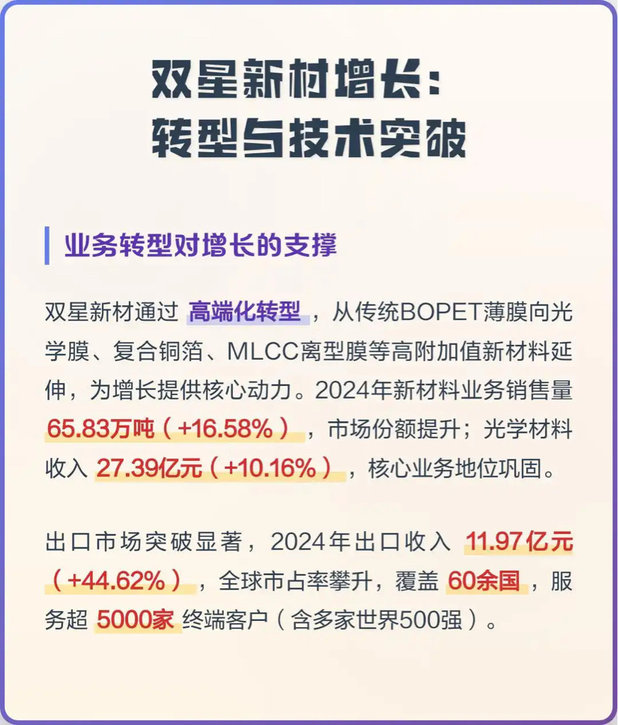 $双星新材(SZ002585)$ 双星新材增长:转型与技术突破业务转型对增长的支撑双星新材从传统BOPET薄膜转产光学膜、复合铜箔等高附加值产品,这一转型直接带动了业绩增长。2024年,新材料销量达到65.83万吨,同比增长16.58%;光学材料收入27.39亿元,增长10.16%。出口方面表现尤为突出,收入11.97亿元,同比增长44.62%,产品覆盖60多个国家,服务客户超过5000家,其中包括多家世界500强企业。在技术突破方面,复合铜箔领域进展显著,2025年3月成功拿到首批量产订单,良率目标提升至90%以上。第二条产线计划于2025年第二季度投产,设计产能5000万平方米,主要供应宁德时代、比亚迪等核心客户。同时,MLCC离型膜已成功进入微容科技供应链,打破了日韩企业的垄断局面,通用级产品持续稳定向三环集团供货。国际客户验证工作进展顺利,2025年上半年销量同比增长118.6%,收入增长144.4%。一期5亿平方米产能已在年内建成,未来规划产能将扩展至20亿平方米。此外,载体铜箔产品在触控用柔性线路板领域实现关键突破,即将签订第二笔采购合同。从市场前景看,BOPET行业供需情况明显好转,2024年产能增长率较上年下降6.45个百分点,产品价格有望逐步回升。高端材料需求持续增长,AI终端、新能源汽车等领域的快速发展,带动了光学基膜、锂电池隔膜等产品的市场需求。MLCC离型膜2025年全球市场规模预计将达到311.5亿元。政策层面,“反内卷”措施的有效实施,缓解了行业价格压力,推动了整体升级。双星新材目前拥有368项专利,生产成本较日企低50%,在产业升级中具备显著优势,有望抓住这一发展机遇。(转自思启资瓶者)