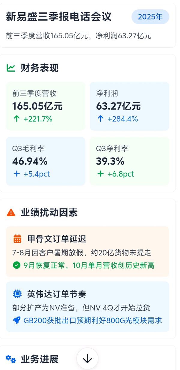 今晚新易盛的管理层在电话会上也给了答案。董秘王总开场就说:“三季度受到个别客户阶段性提货节奏的影响,但这是短期的。Q4订单确定性很强。”CFO林总也补充,“客户需求非常旺盛,但从需求预测到收入确认之间存在周期。”意思很明白:货卖出去了,但客户没提货,收入就没法确收。更细一点,他们提到海外大客户使用VMI(虚拟仓)模式,货先发到仓,只有客户真正提货那一刻,收入才能入账。Q3碰巧撞上“客户放假、提货推迟”——利润没少赚,只是账面节奏错了。电话会里还聊了几个关键信号: