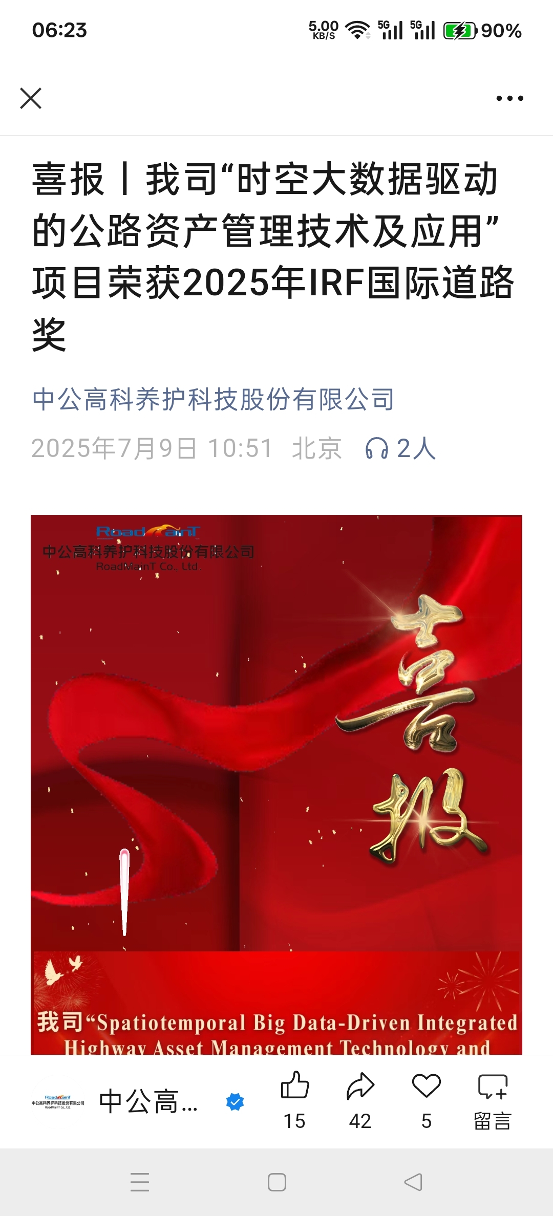 中公高科牵头的“时空大数据驱动的公路资产管理技术及应用”项目于2025年荣获国际道路联合会(IRF)“资产管理与维护”类唯一国际道路奖 ,该奖项被誉为全球道路行业的“奥斯卡”。此前,该技术还获得2024年度中国公路学会科学技术特等奖 ,技术成果被纳入2项国家标准和7项行业标准,例如主导修订的《公路技术状况评定标准》(JTG H20)已成为行业核心规范 。这些成果确立了中公高科在公路资产管理领域的技术话语权。