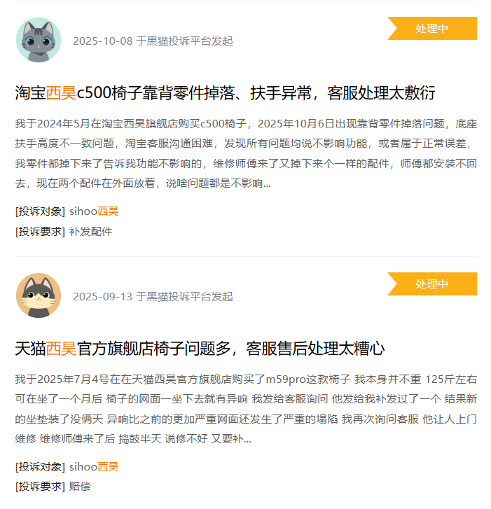 9月13日,另一消费者表示,其于2025年7月4号在天猫西昊官方旗舰店购买了m59pro这款椅子,他体重为125斤左右。可在坐了一个月后,椅子的网面一坐下去就有异响,向客服询问后,补发了一个,结果新的坐垫装了没两天,异响比之前的更加严重,网面还发生了严重的塌陷,他再次询问客服,客服让人上门维修,维修师傅来了后,捣鼓半天,说修不好 又要补发一个。