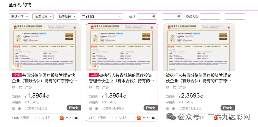 2月底,阿里资产上新增了一条拍卖公告,共青城德伦医疗投资管理合伙企业(有限合伙)持有的广东德伦医疗集团有限公司43.34%股权,该资产估值为338,473,400元,起拍价236,931,380元,于今年3月18日上午10点开拍。但由于0人竞拍,该场拍卖最终流拍。而根据阿里资产公告显示,该资产在今年的4月和7月又进行了两次公开拍卖,四月拍卖起,起拍价下调至189,545,104 元,为估值的56%,几乎是五折拍卖。但4月和7月的两次拍卖也均为0人竞拍,目前也处于流拍状态。