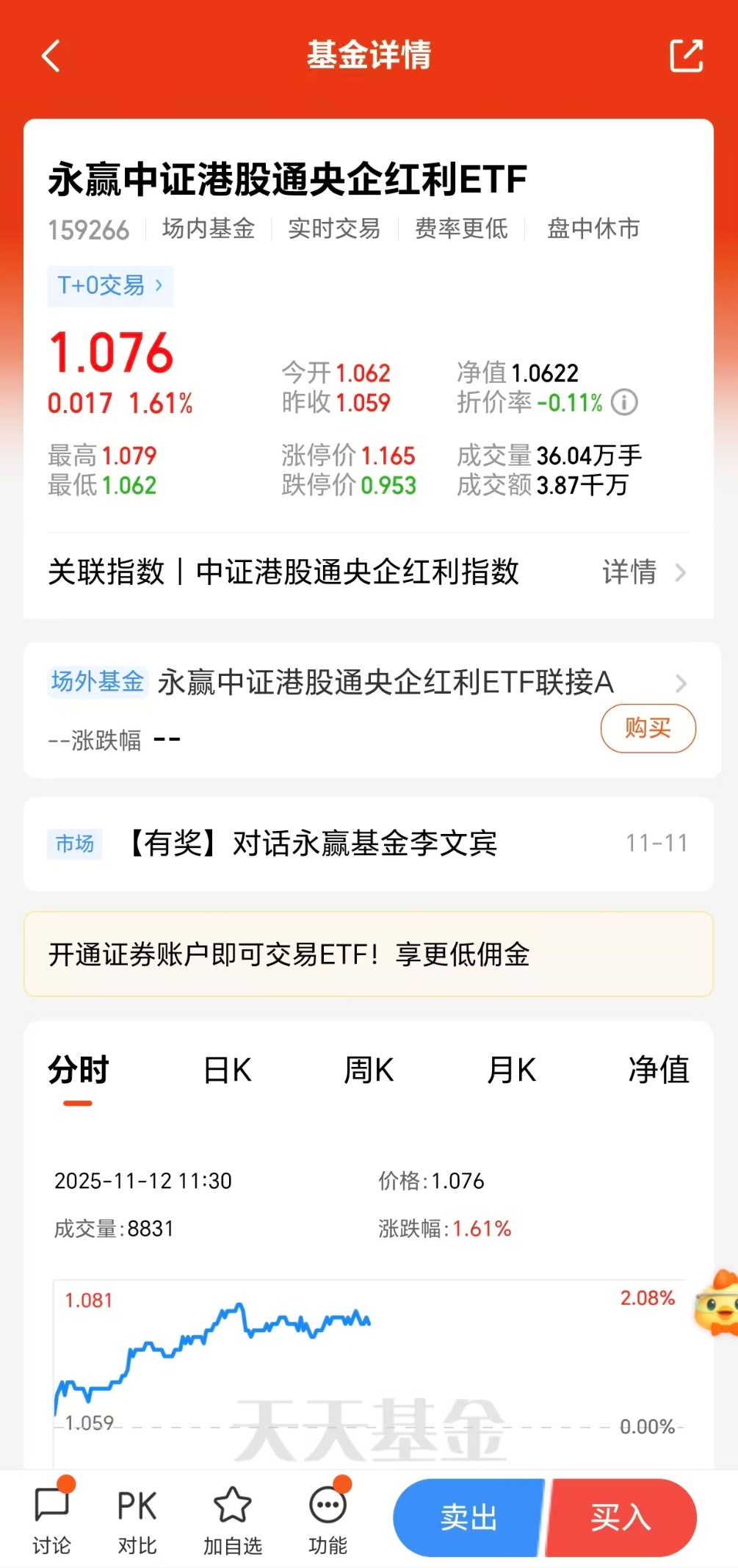 投资想不踩坑又有稳定收益,央企红利是个好选择永赢中证港股通央企红利ETF$港股通央企红利ETF(SZ159266)$及$永赢中证港股通央企红利ETF联接C$(A类:023534/C类:023535)就挺不错的,不用费心研究个股,今天逆势上涨超1%。