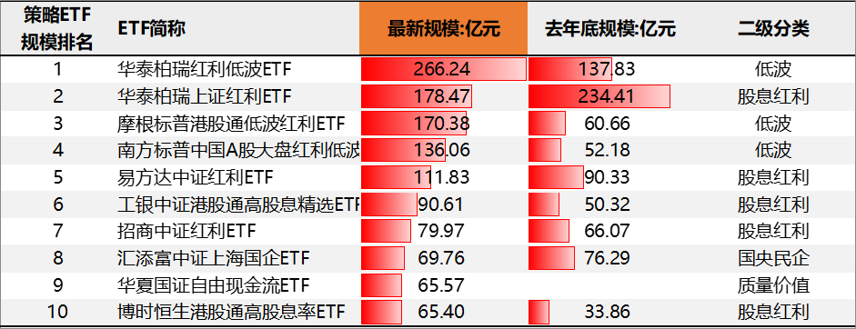 规模前十的策略ETF中,低波3只、股息红利5只、国央民企1只、质量价值1只。