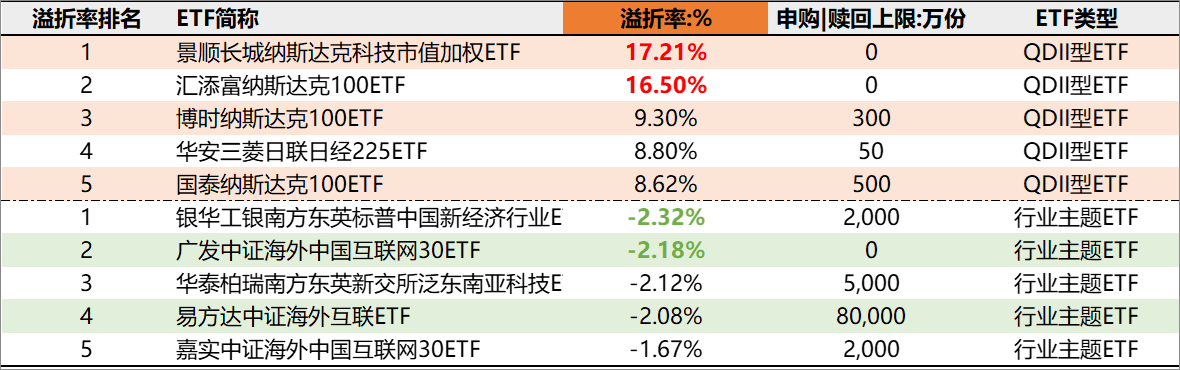本周,溢价率前5的股票ETF,QDII型ETF占5只,行业主题ETF占0只。景顺长城纳斯达克科技市值加权ETF以17.21%的溢价率折桂,需要注意的是,这只ETF当前停止申购,如基金公司协调了新的外汇额度过来,会出现快速杀溢价的下跌行情。折价率前5的股票ETF,行业主题ETF占5只,QDII型ETF占0只。银华工银南方东英标普中国新经济行业ETF以-2.32%的折价率垫底,需要注意的是,这只ETF每日的赎回上限为2000万份,折价会吸引场内买入场外赎回套利。