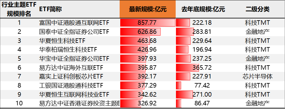 规模前十的行业主题ETF中,科技TMT6只、金融地产3只、芯片半导体1只。