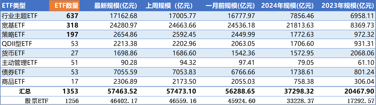 ETF最新总规模为57463.52亿元,其中,股票ETF规模46402.17亿元。本周宽基ETF规模减少382.69亿元;行业主题ETF规模增加156.91亿元;策略ETF规模增加62.41亿元。今年,股票ETF的规模相比去年底增加39.65%。