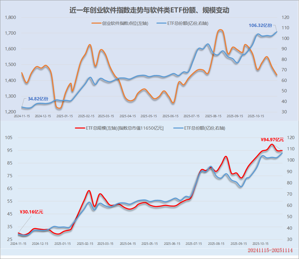成指数走势和份额变动对比图看,两者无显性关系。份额整体是台阶式上升的,今年1月下旬、7月下旬和9月下旬分别有上一个台阶。而软件指数的行情主打一个高波动,从8月下旬以来整体是下跌的,同期份额从约80亿份增长到106亿份。份额与规模的走势基本一致,最近半个月是份额增长,规模下行。