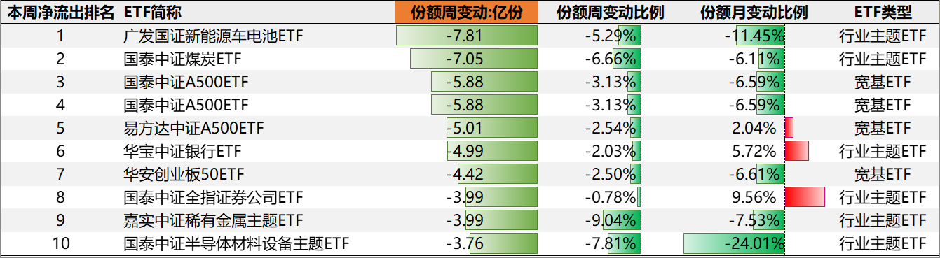 本周份额净流出最多的10只股票ETF中,宽基ETF和行业主题ETF分别有4、6只。份额净流出最多的广发国证新能源车电池ETF,流出-7.81亿份。份额周净流出比例最大是嘉实中证稀有金属主题ETF,本周份额减少-9.04%。