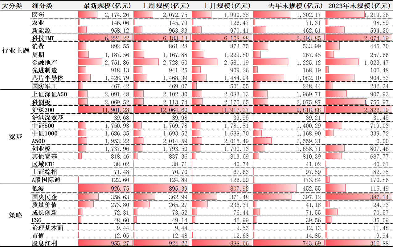 本周,规模增加较多的股票ETF二级分类有:医药、科技TMT、低波,周增规模分别为:101.51亿元、41.09亿元、31.36亿元。规模减少较多的股票ETF二级分类有:沪深300、A500、创业板,规模分别减少:163.33亿元、61.37亿元、55.54亿元。
