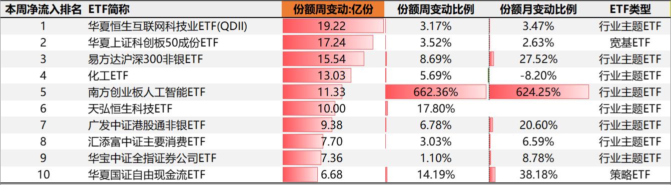 本周份额净流入TOP10的股票ETF中,宽基ETF、行业主题ETF和策略ETF分别占1、8、1只。份额净流入最多的华夏恒生互联网科技业ETF(QDII),流入19.22亿份。份额周净流入比例最大是南方创业板人工智能ETF,本周份额增加662.36%。