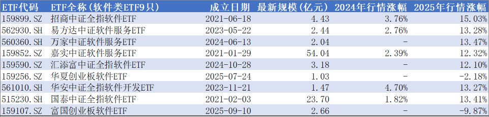 今年有2只软件类ETF新发,9只的规模都不大,嘉实基金的软件ETF54亿元占了半壁江山,业绩上剔除今年成立的两只,7只的业绩普遍再12%到15%,涨幅确实不高。