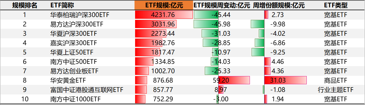 本周新增份额带来的规模增长最多的是华安黄金ETF,周增31.03亿元。华泰柏瑞沪深300ETF、南方中证500ETF、易方达创业板ETF、富国中证港股通互联网ETF、南方中证1000ETF规模周变动与周净份额规模变动方向相反。