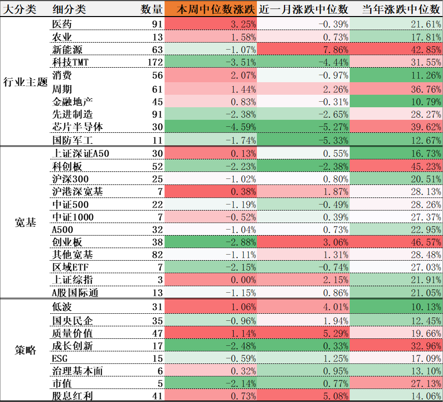本周涨幅中位数较大的行业主题ETF有:医药、消费、农业,涨幅分别为:3.25%、2.07%、1.58%;涨跌中位数较大的宽基ETF有:沪港深宽基、上证深证A50、上证综指,分别为:0.38%、0.13%、0.00%;涨跌中位数靠前的策略ETF有:质量价值、低波、股息红利,分别为:1.14%、1.06%、0.73%。
