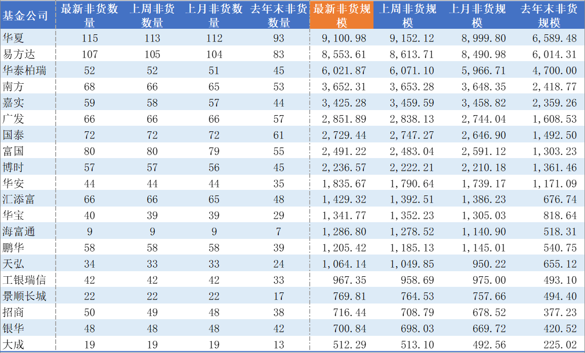 目前,国内有55家基金公司旗下有ETF产品,其中55家有非货ETF。非货ETF排名前十的基金公司的份额为76.93%。