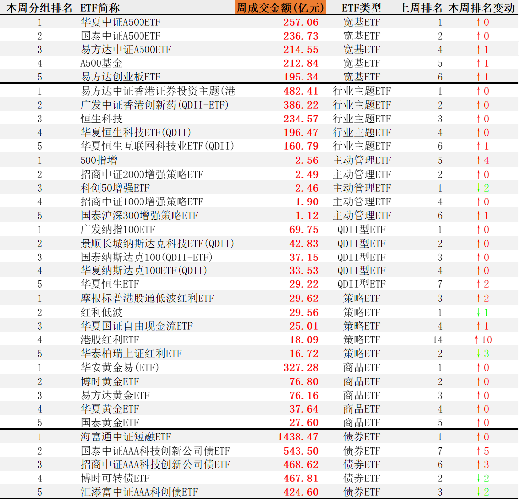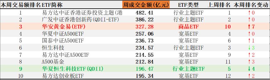 本周,股票ETF总成交额13240亿元,占万得全A成交额的12.96%。成交额前十的非货债ETF中,有宽基ETF5只,行业主题ETF4只。成交额最大的是易方达中证香港证券投资主题(港股通)ETF,482.41亿元。本周,成交排名上升最多的是华安黄金易(ETF),上升7名;排名下降较多是华夏恒生科技ETF(QDII),下降4名。