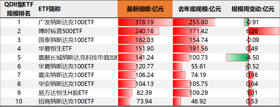 规模前十的QDII型ETF中,增长最多的是博时标普500ETF,增长6.28亿元,减少最多的是景顺长城纳斯达克科技市值加权ETF,减少-4.50亿元。