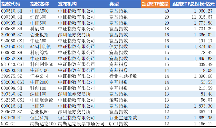 当前,总共有473只指数有ETF跟踪,其中,跟踪ETF数量最多的指数是宽基指数——中证A500,有40只ETF跟踪。跟踪ETF规模较大的指数是沪深300、中证A500、上证50,规模分别为:11915.67亿元、1960.27亿元、1893.30亿元。