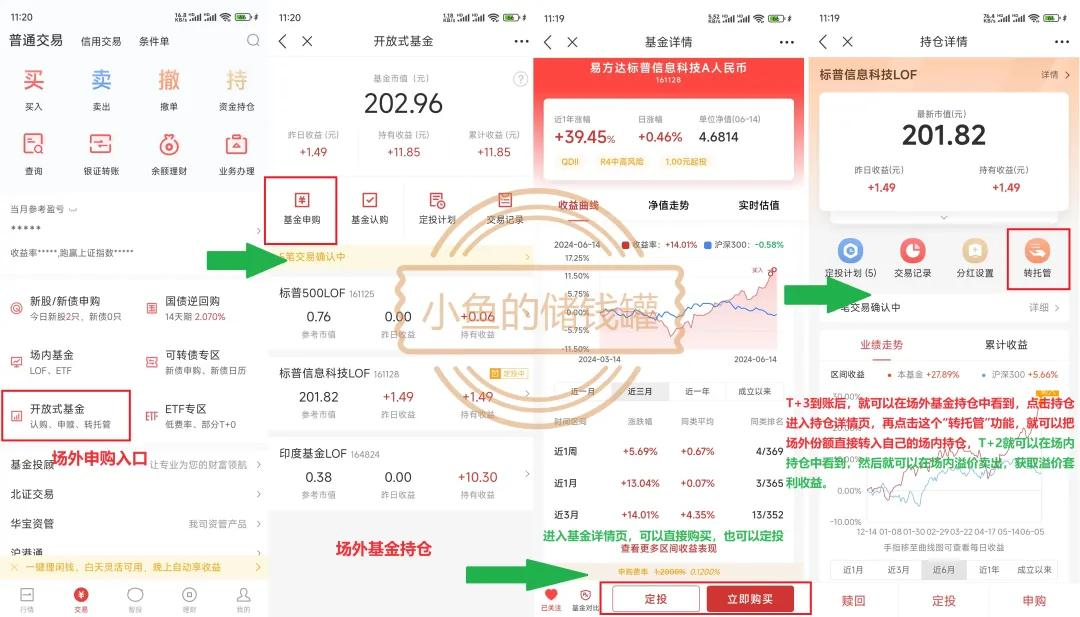 最近还是有很多朋友不知道场外怎么申购,怎么场外转托管到场内。上图是某宝的操作流程图,一看就懂。还有懒人模式,可以给场外基金设置定投,然后几天再去转托管一次。