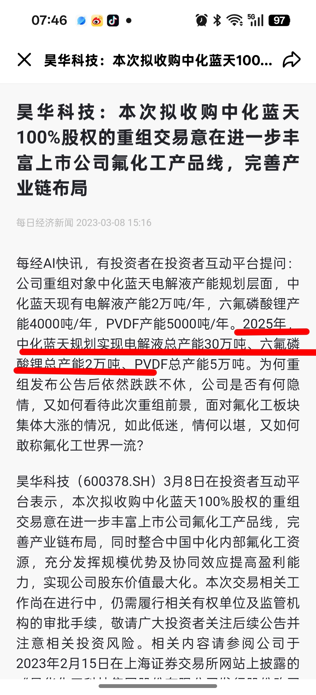 【2023年,中化蓝天规划实现到2025年底前,电解液总产能30万吨、六氟磷酸锂总产能2万吨、PVDF总产能5万吨。过去两年了,电解液达到了25万吨,接近30万吨的规划目标。但六氟磷酸锂从当时的4000吨只增加到8000吨,距离规划目标还差1.2万吨。这是一直没有建设?还是正在建设但进度拖延了?什么原因呢?】