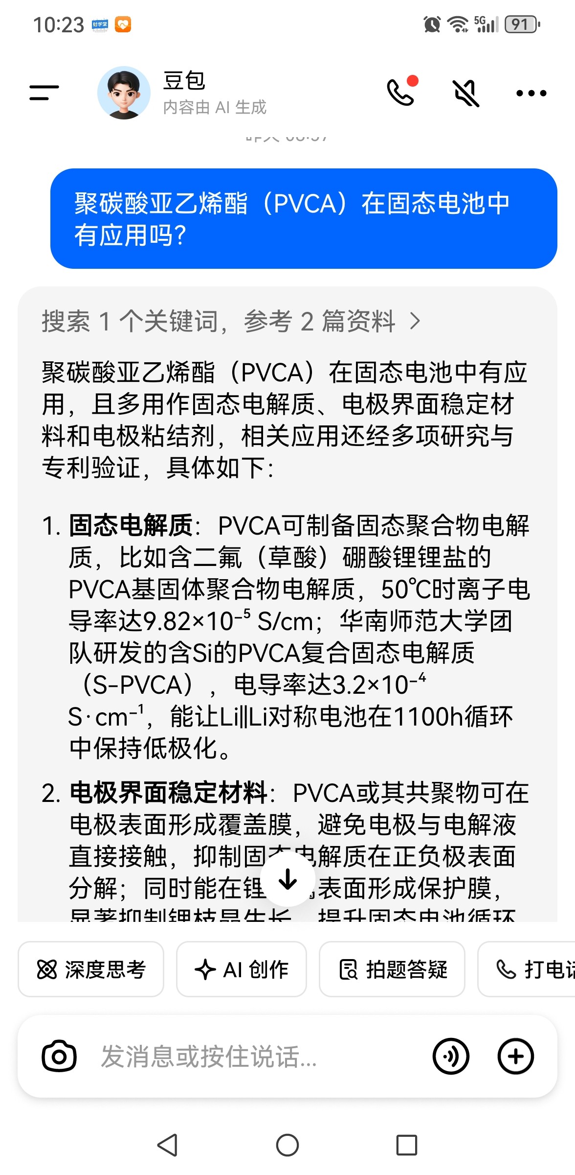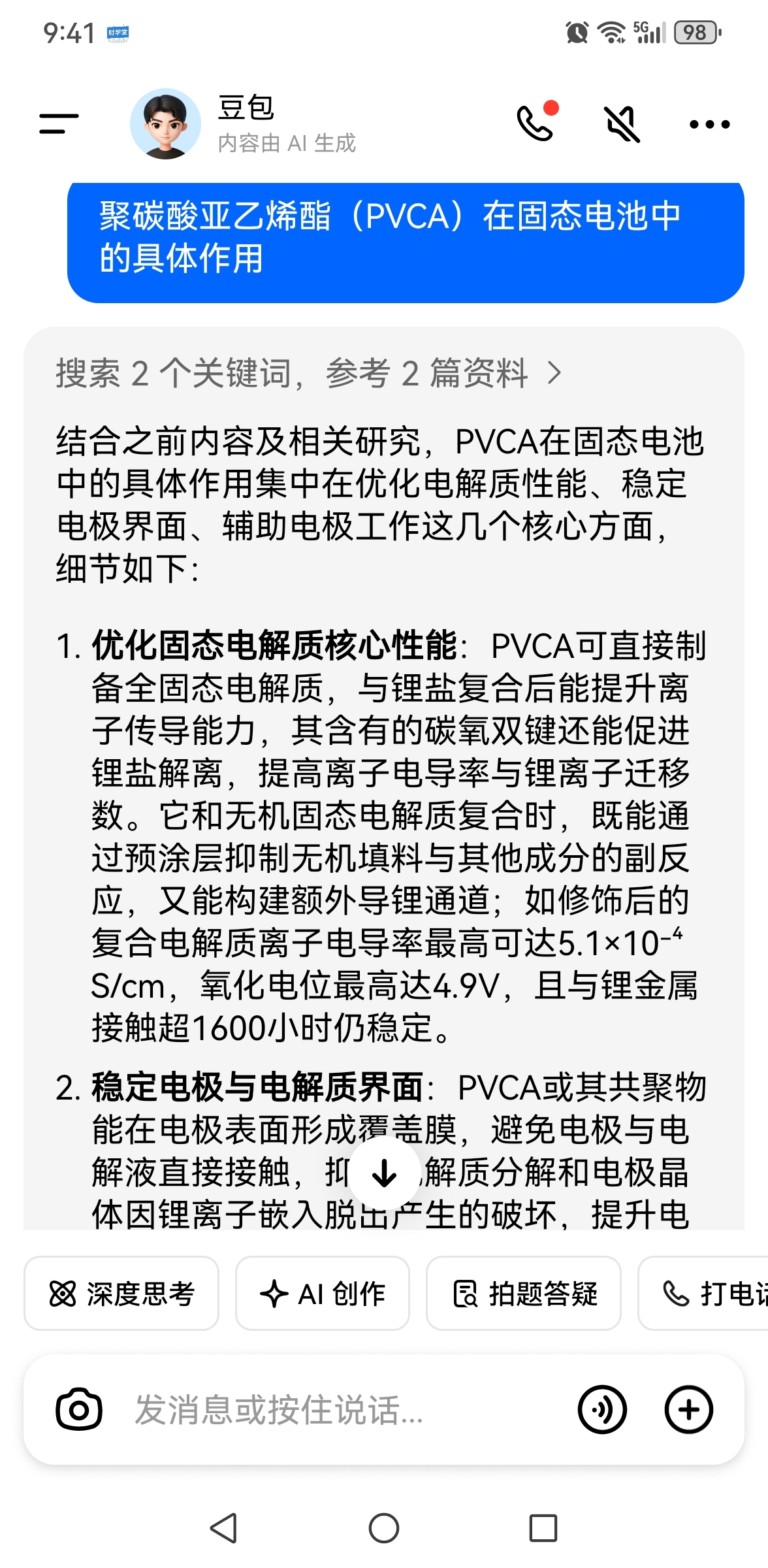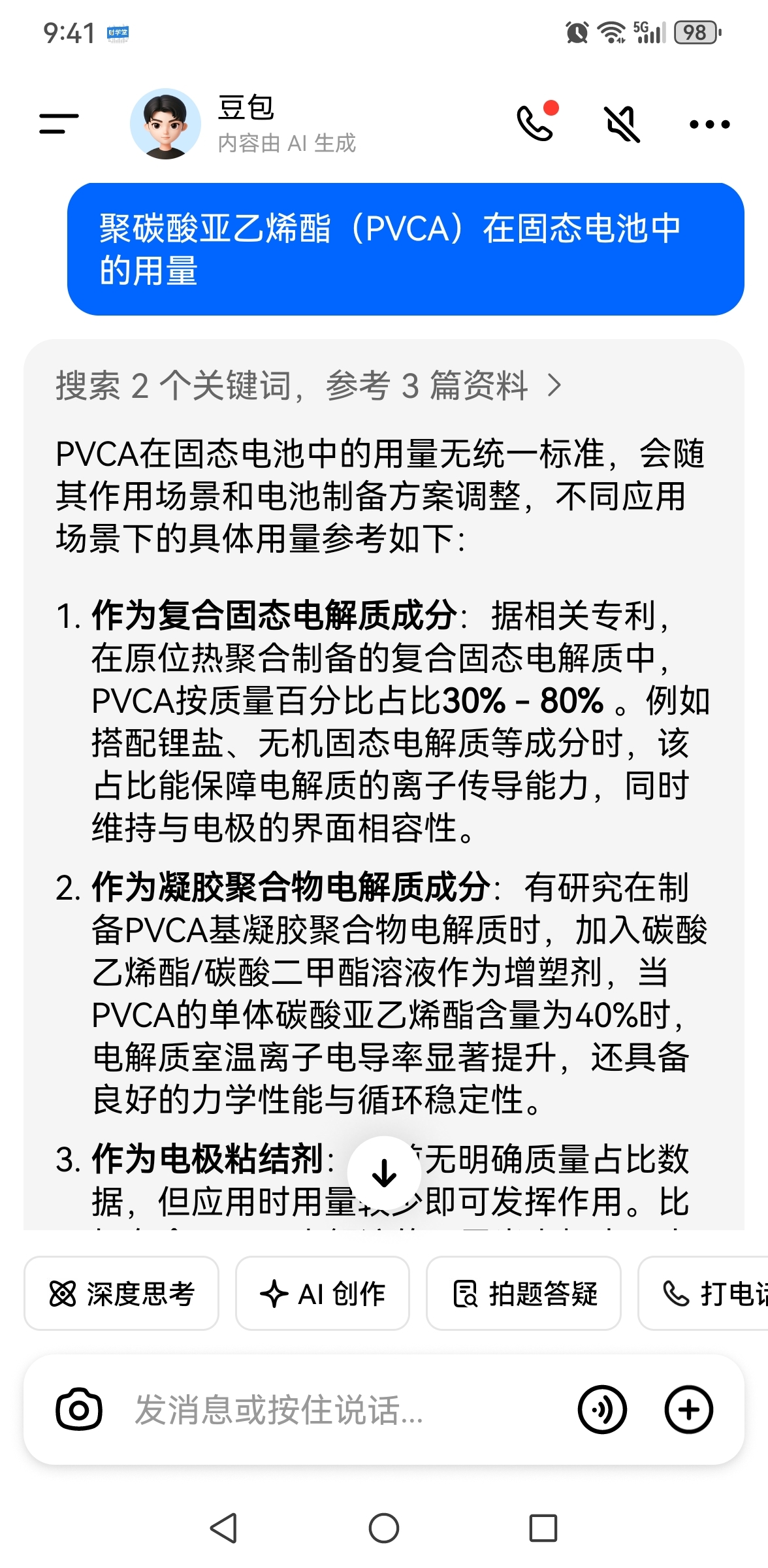 $富祥药业(SZ300497)$ 固态电池是动力电池的新发展方向,而碳酸亚乙烯酯(VC)也是固态电池中固质电解质生产所需的原料,即固态电池中需要用到由VC为原料生产的聚碳酸亚乙烯酯(PVCA),使用量还不低,相关信息见如下转引豆包Al的信息内容,可期待VC的需求量将随着固态电池生产线的投入扩大而有较大的增长。