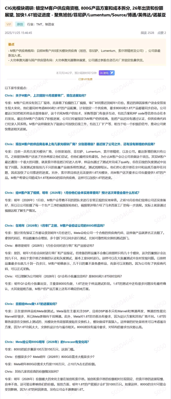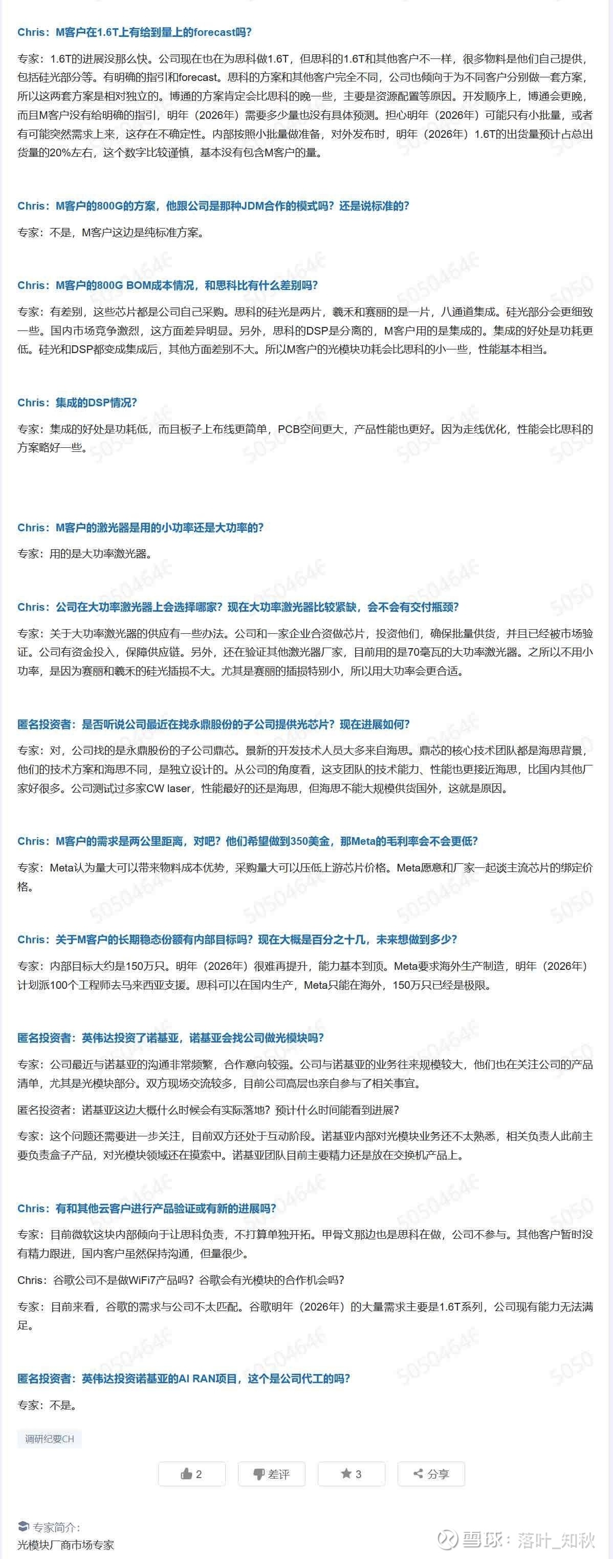 二是之前说的26年1.6T出货占比20%是谨慎说法,不包含META的1.6T需求,目前META还没给出26年1.6T的明确需求指引。意味着1.6T实际出货量还要上调,之前预计是80—100万个,就算META150万只中20%是1.6T,那也增加30万个。