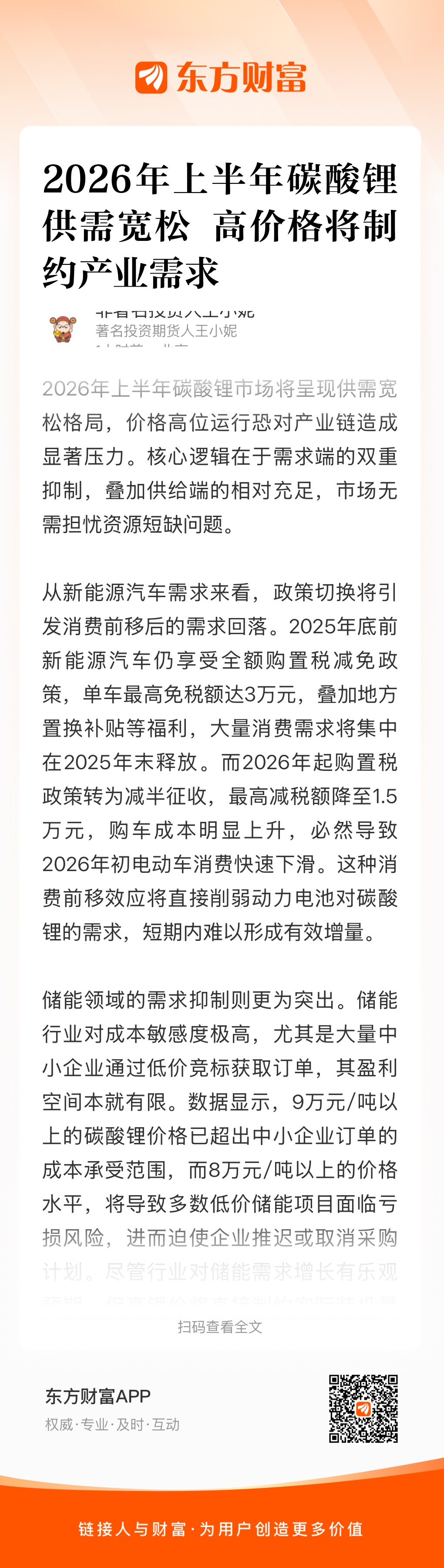 2、出口与产品升级对冲国内短期波动:2025年前十月新能源汽车出口202.4万辆,2026年出口许可证管理倒逼高质量出海,比亚迪等头部企业海外销量预计增长50%,海外订单直接拉动电池需求;叠加智能驾驶普及、新车迭代,2026年全球EV对碳酸锂需求预计达112.4万吨LCE,同比增长25%,绝非“短期难以形成有效增量”。
