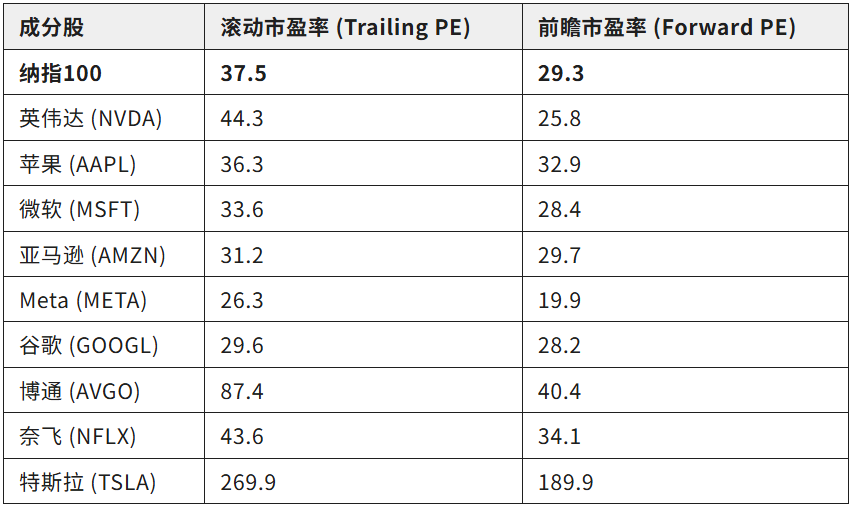 表1 纳斯达克100及其主要成分股最新滚动市盈率及其前瞻市盈率(2025.11.21)