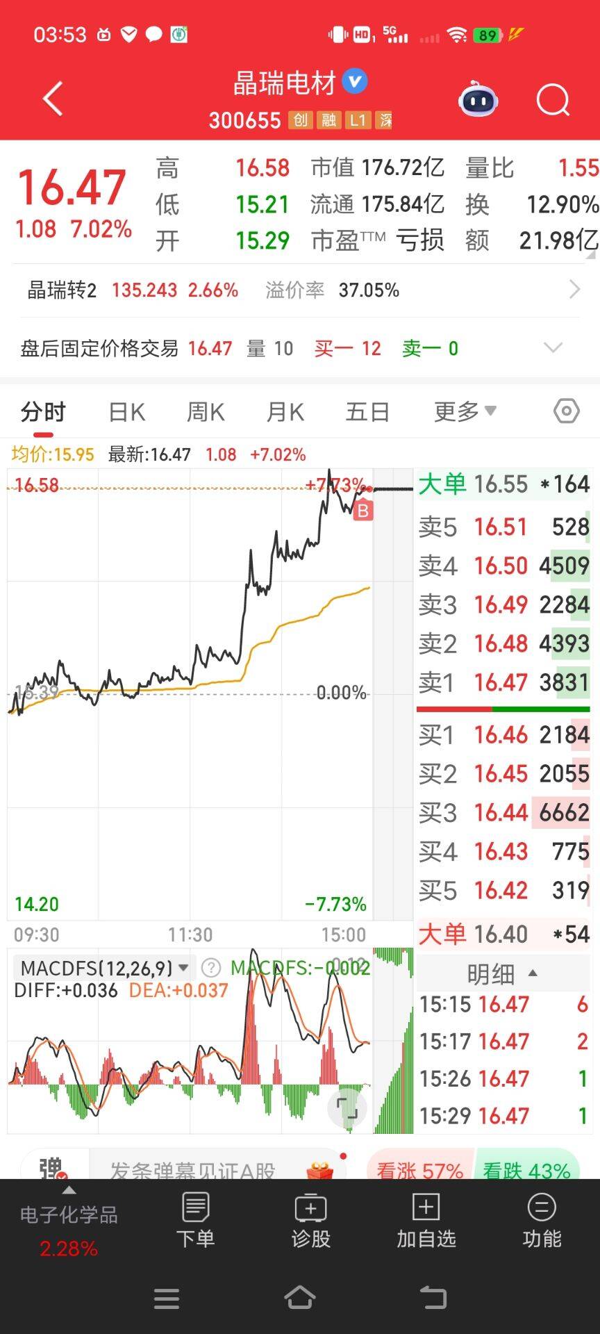 总结:符合量化模式内右侧买点操作。今天拿货有点风险,量不小。尾盘从高盟新材、广生堂、依依股份和晶瑞电材里面4选1拿的晶瑞电材。感觉拿得一般。