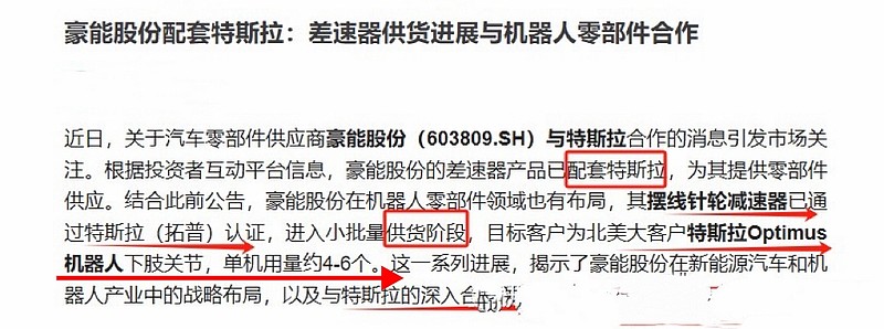 豪能股份 :公司产品摆线针轮减速器已通过特斯拉 认证并进入供货阶段,供货客户是北美大客户特斯拉Optimus机器人 下肢关节。豪能股份的差速器产品已配套特斯拉,为其提供零部件供应。豪能股份与特斯拉在人形机器人领域密切合作。