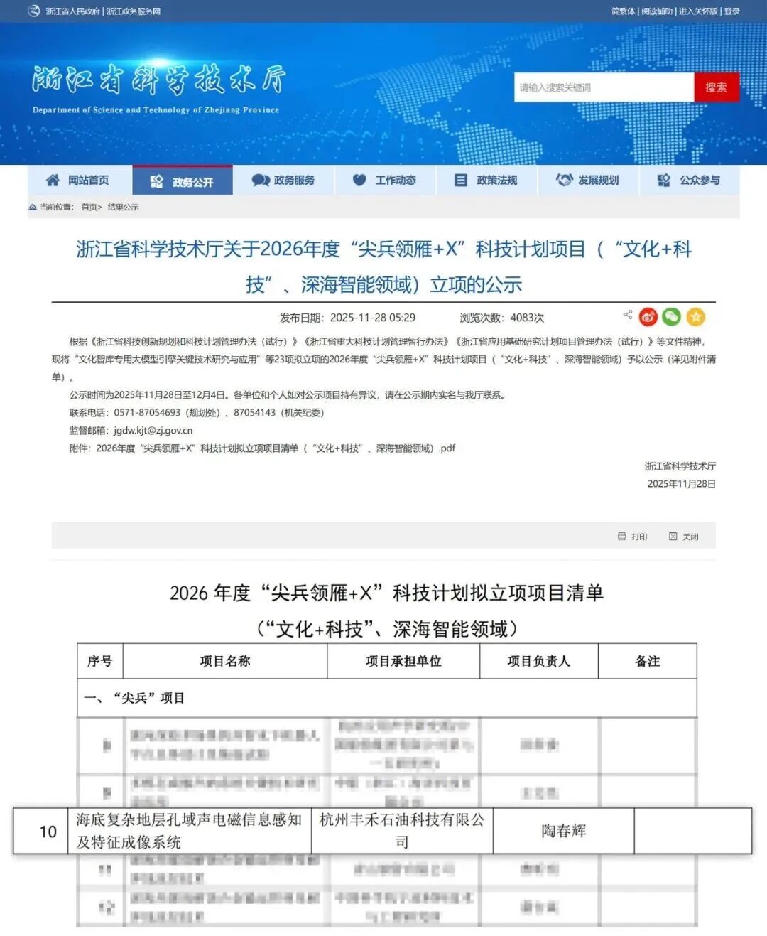 近日,由神开股份旗下控股子公司杭州丰禾石油科技有限公司(以下简称“神开丰禾”)牵头,联合自然资源部第二海洋研究所、华东岩土勘察设计研究院有限公司、浙江大学、浙江海洋大学、中国能源建设集团浙江省电力设计院有限公司合作研发的“深海地层孔域声电磁信息感知及特征成像系统”项目,经严格评审和激烈角逐,成功入选浙江省2026年度“尖兵领雁+X”科技计划尖兵项目(又称“浙江省重大科技项目”)!本次入选“省重大”,标志着神开丰禾在深层探测领域核心技术研发和产学研协同创新方面取得重大突破,正式从“深地”走向“深海”,开启深海探测新纪元!