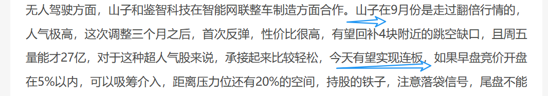 周末专门提势的山子高科,今天成功实现连板,选股这块我说第二,没人敢说第一。山子高科是无人驾驶,叠加低价,以及重整概念,公司成立谦合汽车参与哪吒汽车的重整,本月将完成合并,后续将持有哪吒汽车68%的股权,无人驾驶方面,公司和鉴智科技合作智能网联汽车。今天浙江世宝成功加速大幅高开,说明市场对于无人驾驶方面认可,那么地位的山子高科当然也受到追捧,开盘短暂洗盘之后,快速封住涨停,全天纹丝不动,就着强势势头,明天还要冲板,那么早上看到提势吸筹的就吃香了,不过需要注意的是,明天山子还会冲板,但是接近4快的强压力位,这里容易遇到抛压,所以可以接近4快落袋,没有介入的就暂时不要追了,相对还是有点高了,等山子回踩5日线才是下一个介入点。