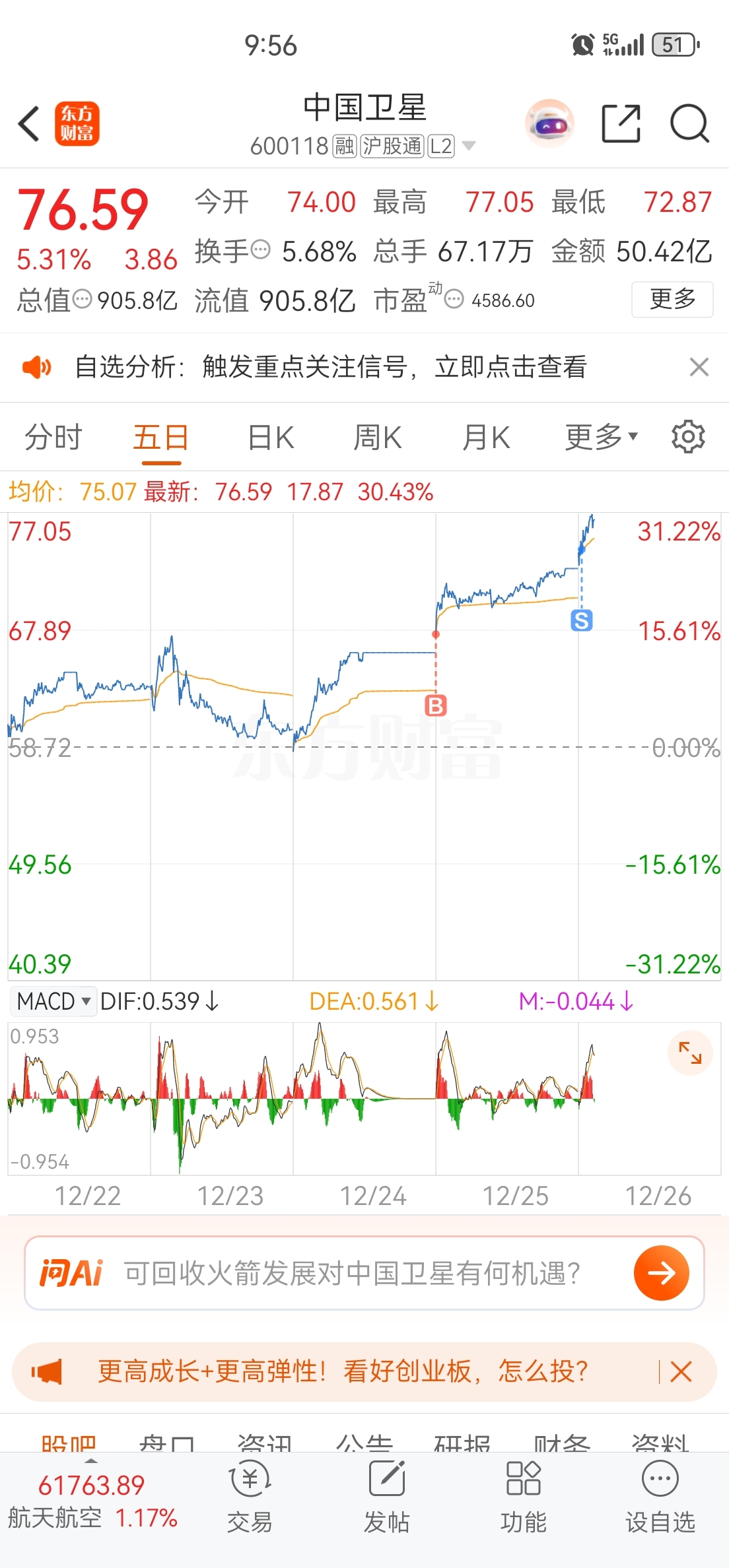 3. 市值与弹性优势:总市值223.7亿,远小于中国卫星的905.8亿,流通盘182.5亿更易被资金撬动,在航天板块延续行情时,弹性远超大市值龙头。