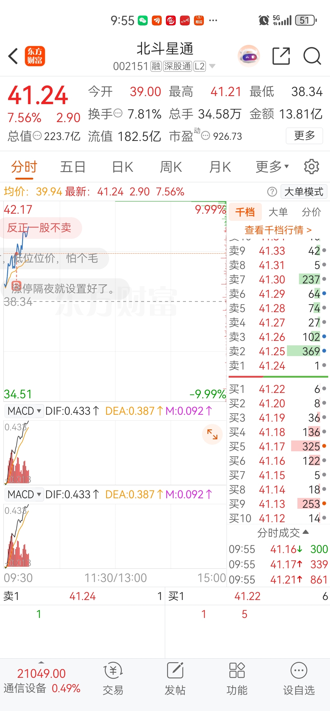 2. 分时承接强劲:早盘低开至38.34元后快速拉升,9:55股价冲至41.24元,涨幅达7.56%,MACD指标低位金叉,量能持续放大,资金抢筹迹象明显。