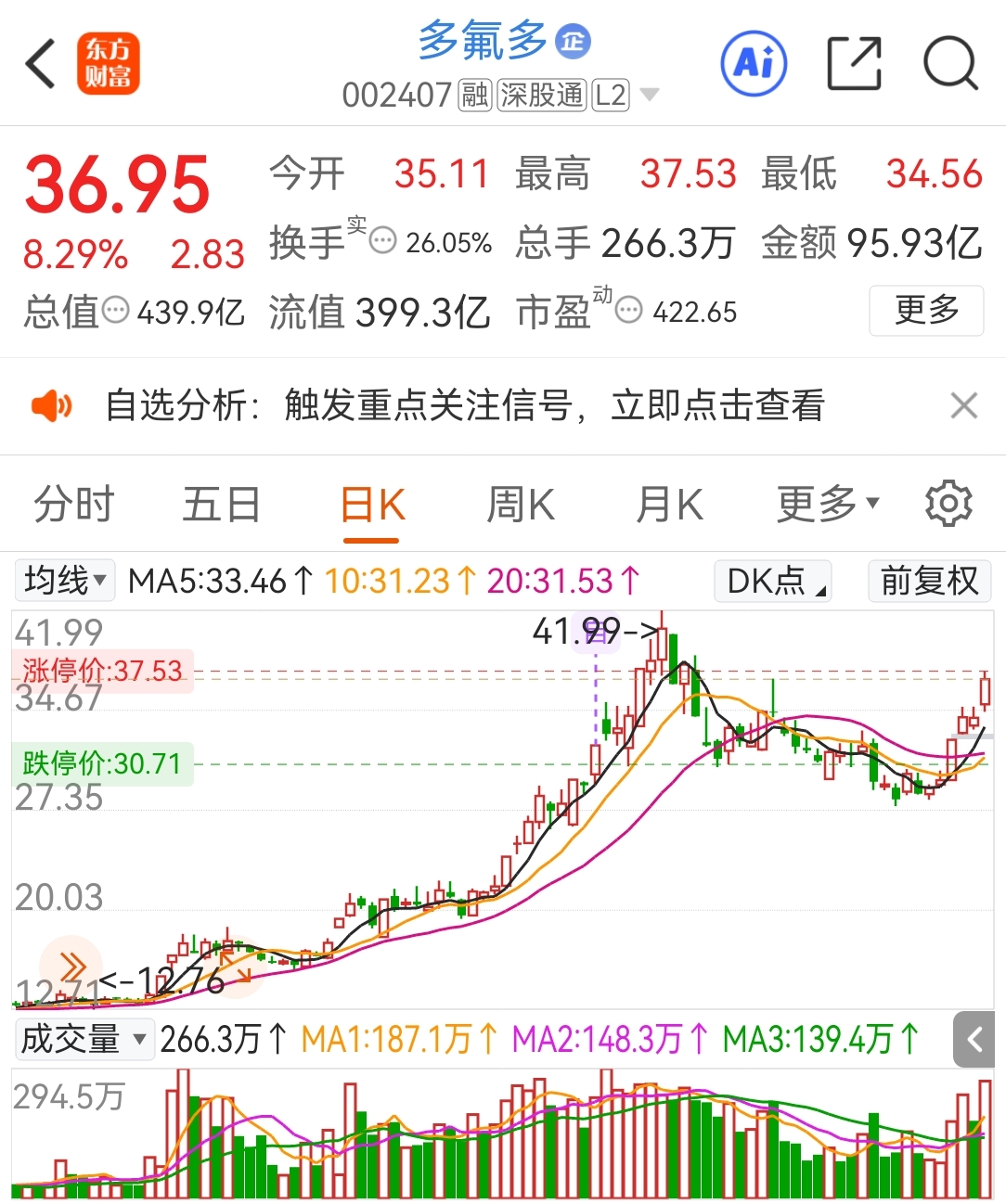 多氟多:这些化工类型的,大家主要看原料端的价格,价格上去了,它就会有很好的支撑,短期调整是很好的机会,后面价格一定是要上去的。当然有时候也不会一直跟原料价格,涨到啥时候就看自己风险承受能力。