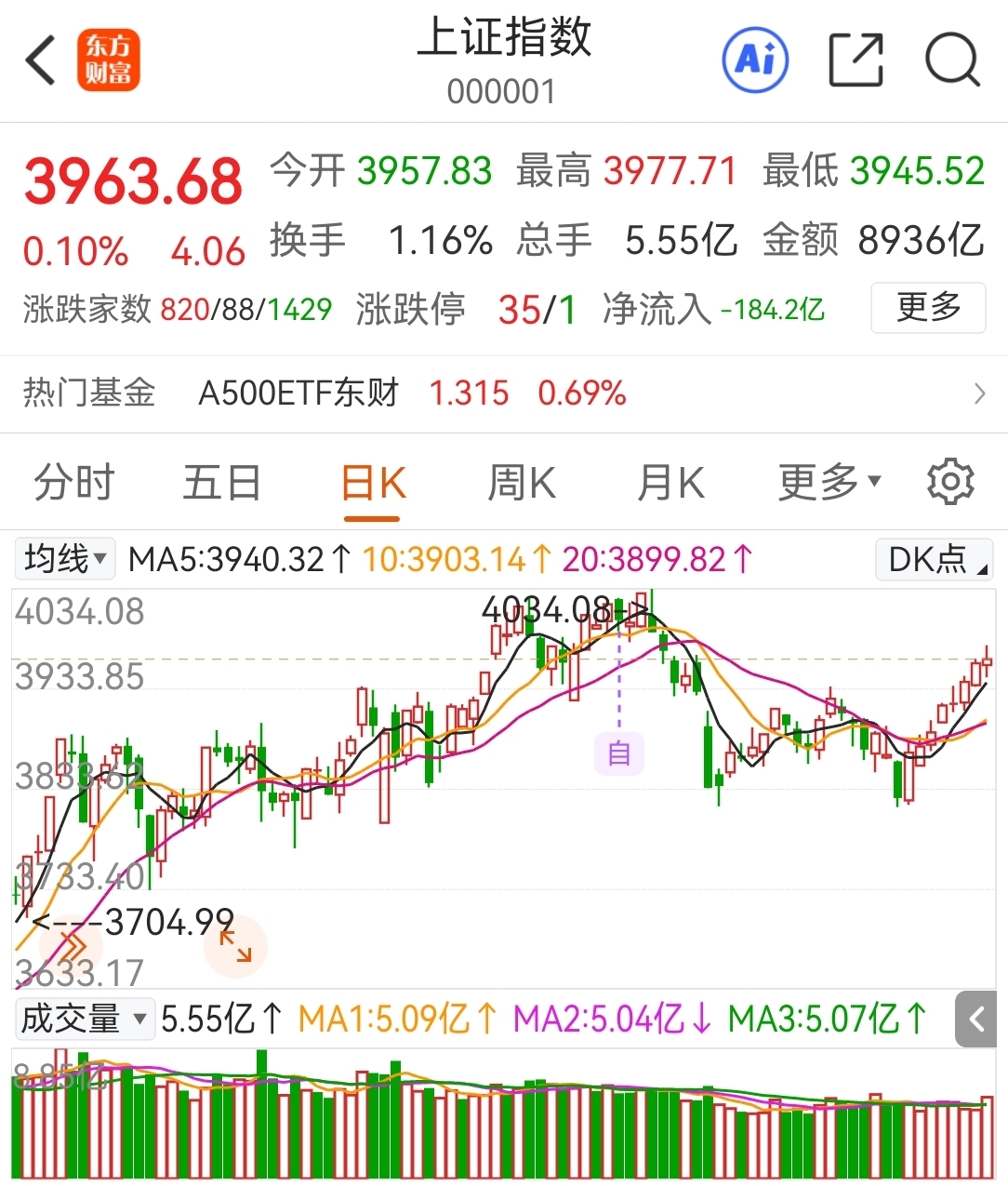 八连阳,从3815的低点一直摸到了3963,之前每次的连续阳线短期调整后,都会有接着一波大涨,向上不回头。最近的一次七连阳之后到了4034的高点后开始调整,量一直没有放上去。今年还有三个交易日,年k收到4000大概率是硬指标,接下来几天会继续摸高。今天放量收小阳线,盘中突然有一波下杀,应该是多次上攻没突破高点,触发机制,不过后面就上来了,可能是下周的一个预告。三个交易日全红的概率不大,会有调整,最后摸上4000。两种情况,一种是一路微涨最后一天收到4000,这种情况下最好;另一种情况提前一两天摸到,超过4000了,超了以后还追吗?肯定就不追了,今年就这样了,明年继续。以上是对指数的观点。