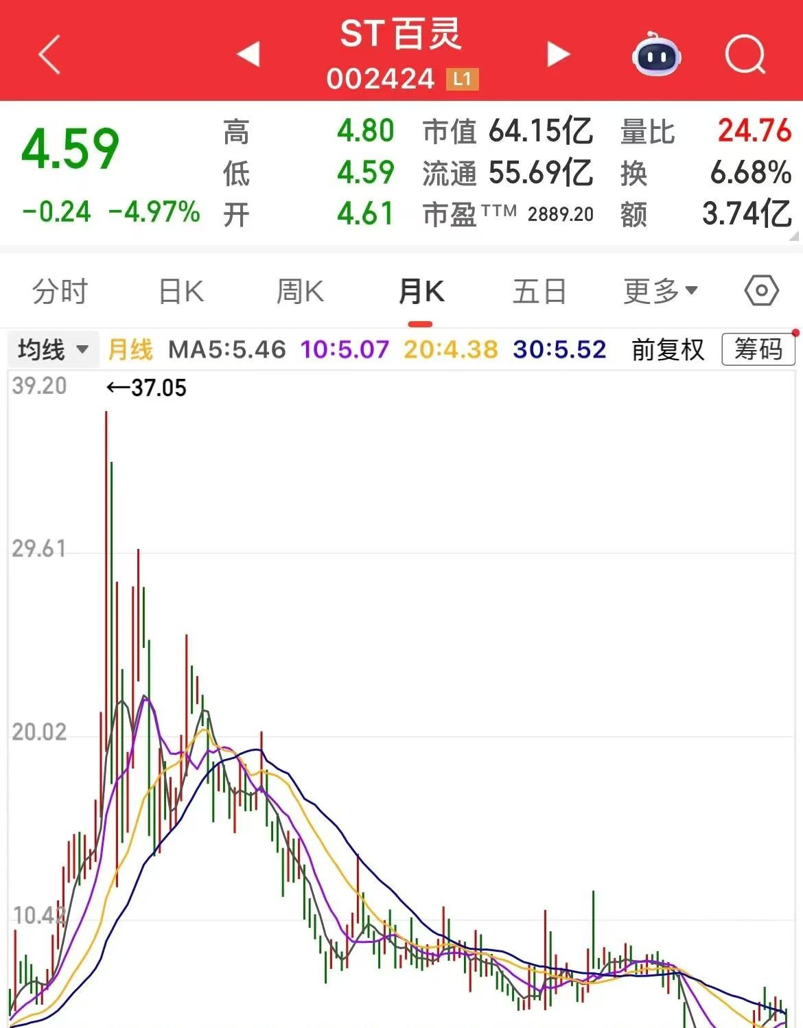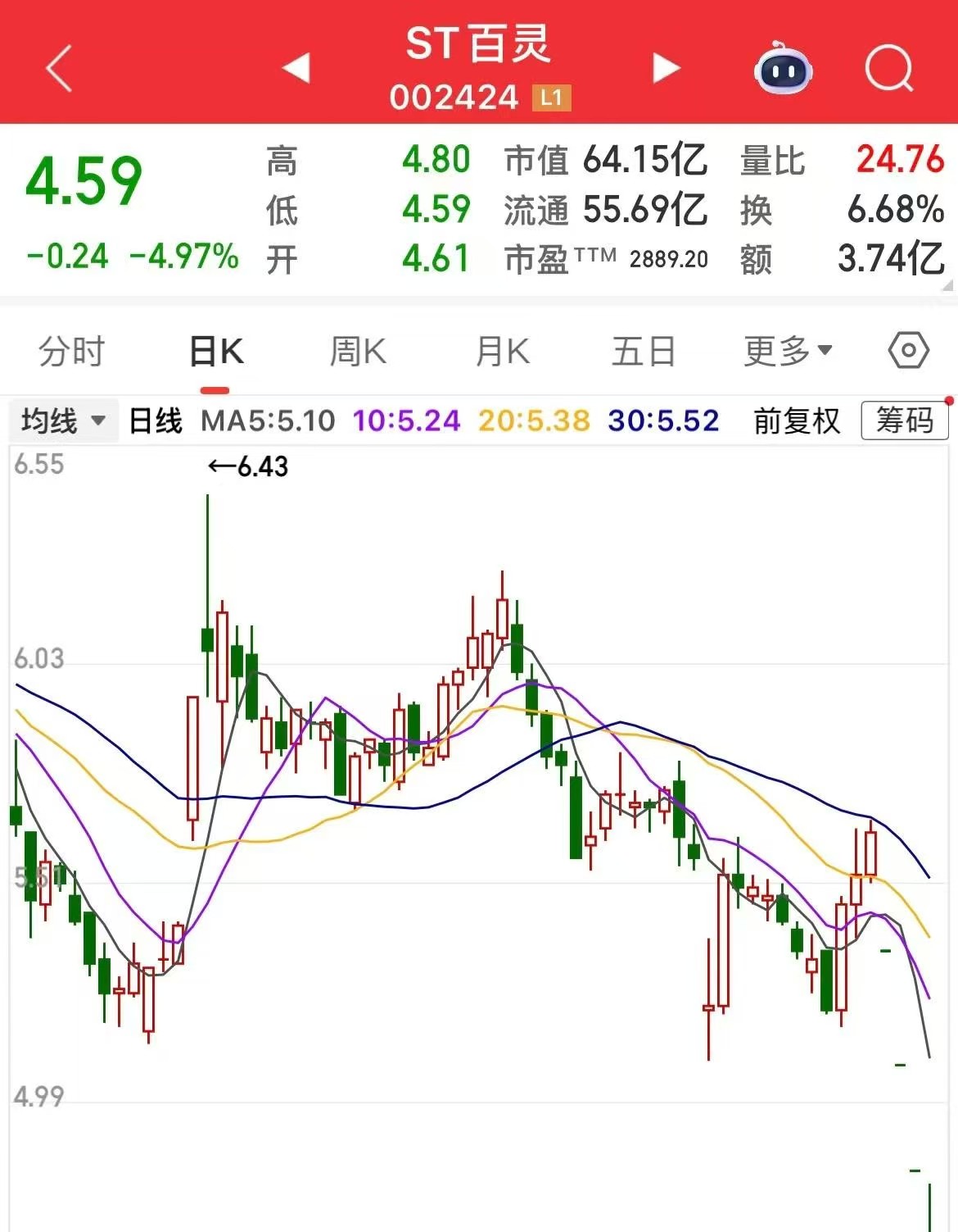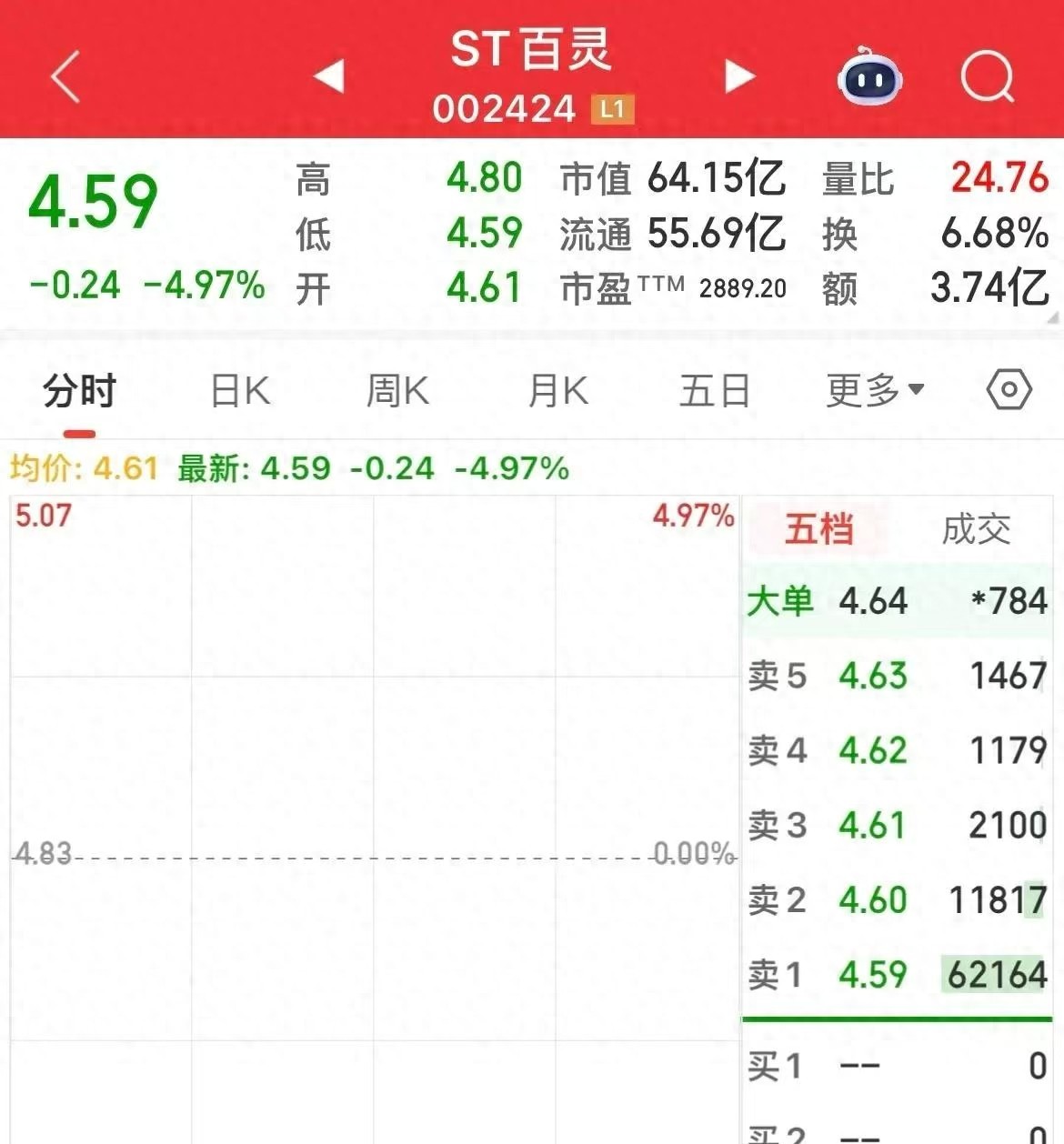 这走势,真够狠的。昨天还觉得快到底了,今天一开盘,心直接凉了半截。$ST百灵(SZ002424)$四个跌停后终于开板,不少人以为是抄底良机,集合竞价那会儿,直接冲进去1.5亿资金。股价那时候才4.61元,离跌停价就差两分钱,看着跟地板似的,谁还想到会被反手按回去。