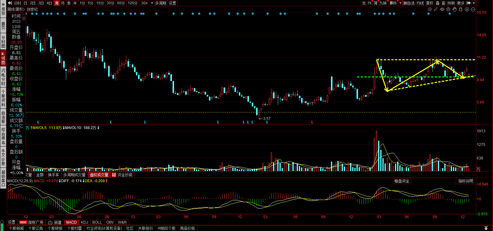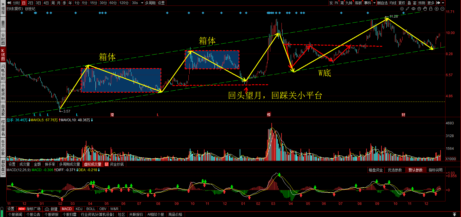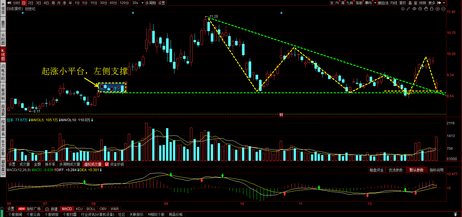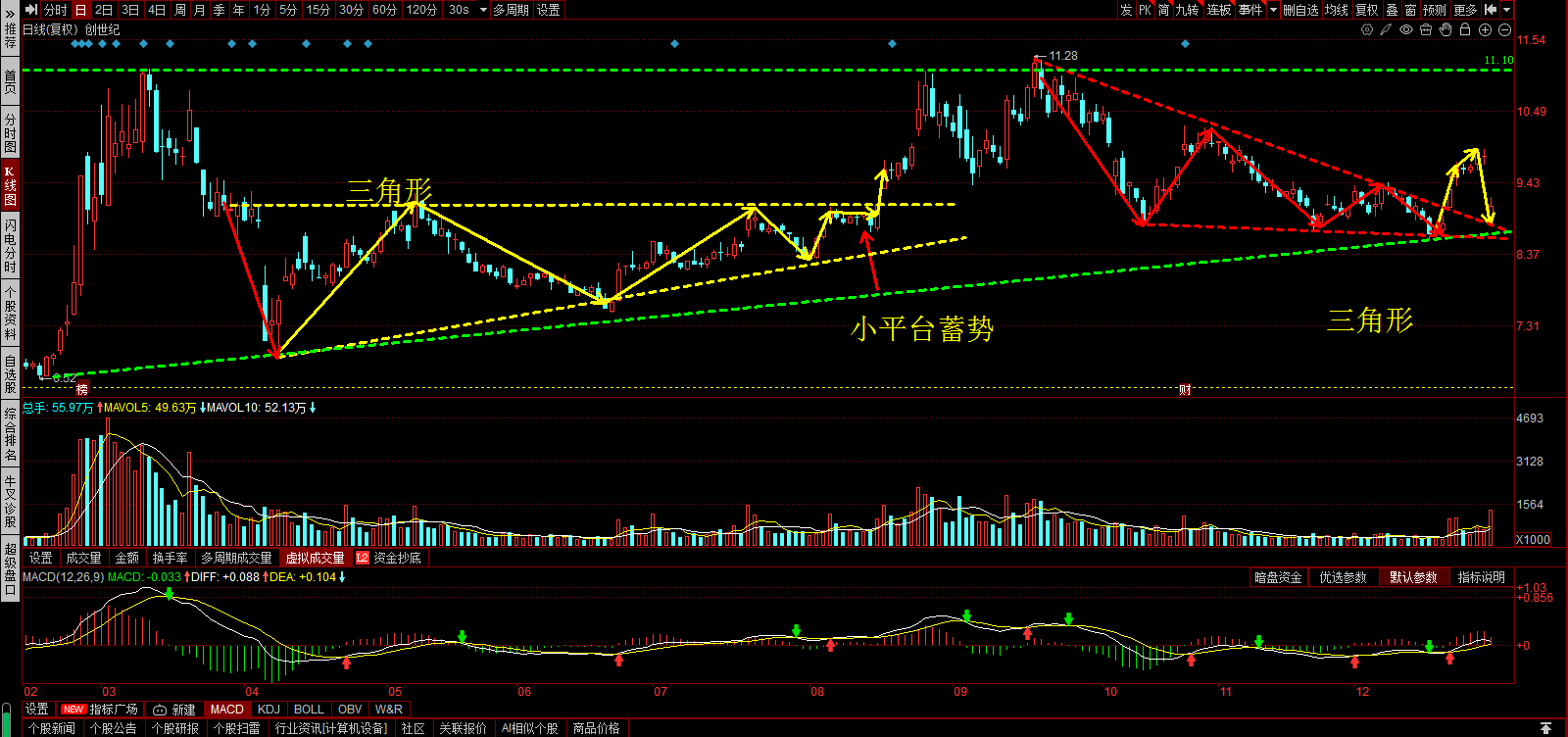 三角形突破回踩,在左侧小平台处止跌,洗盘到位。
