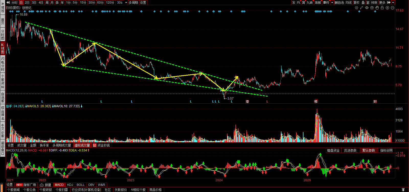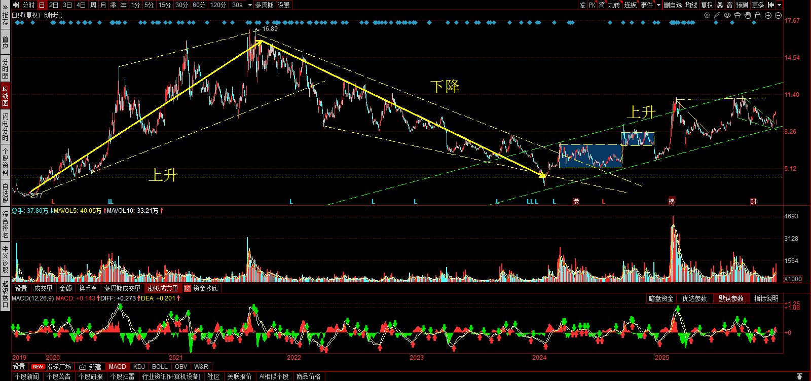 第一阶段上升趋势:2019-2021,2.77-16.89,近6倍的涨幅。