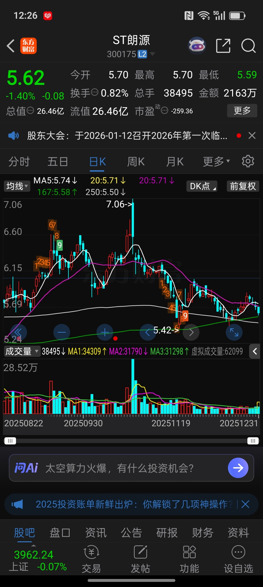 $ST朗源(SZ300175)$ 朗源今天终于放量了,虽然是下跌放量,但春江水暖鸭先知,在支撑位水下买入机会是很难得的,也可能是历史性的机会,想在2026年大展宏图的股民千万不要放过。