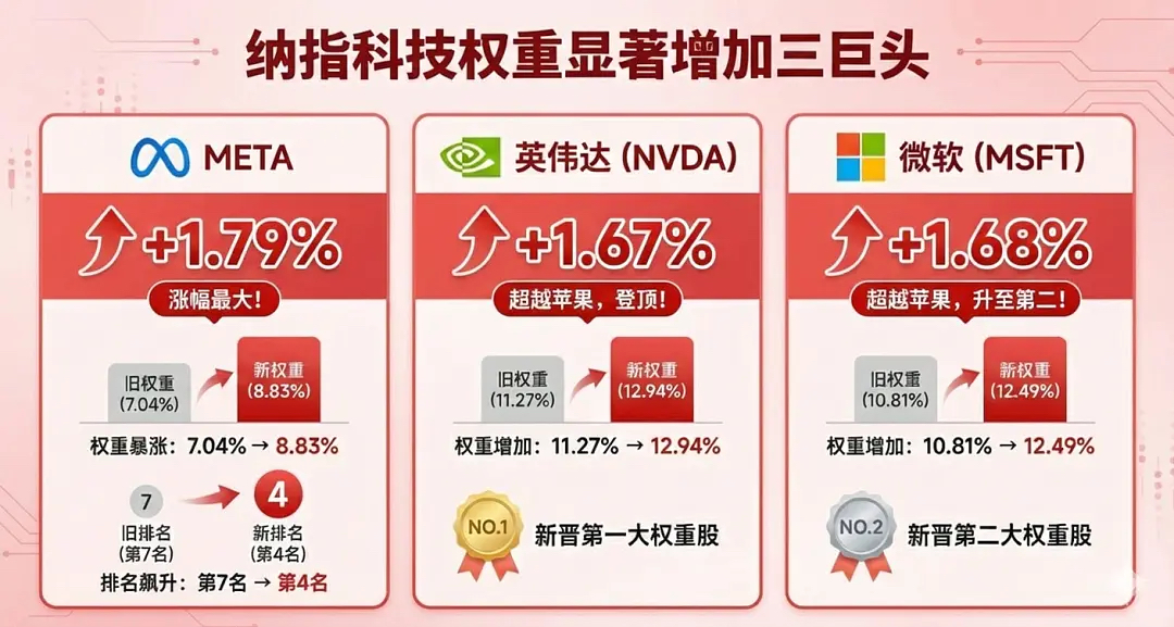 英伟达:权重从 11.27% 增至 12.94%(增加1.67%),超越苹果成为第一大权重股。