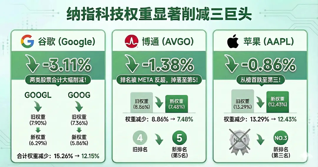 Meta、英伟达 和 微软 增加了大量权重,而 谷歌、博通 和 苹果 则遭到了被动的权重削减。