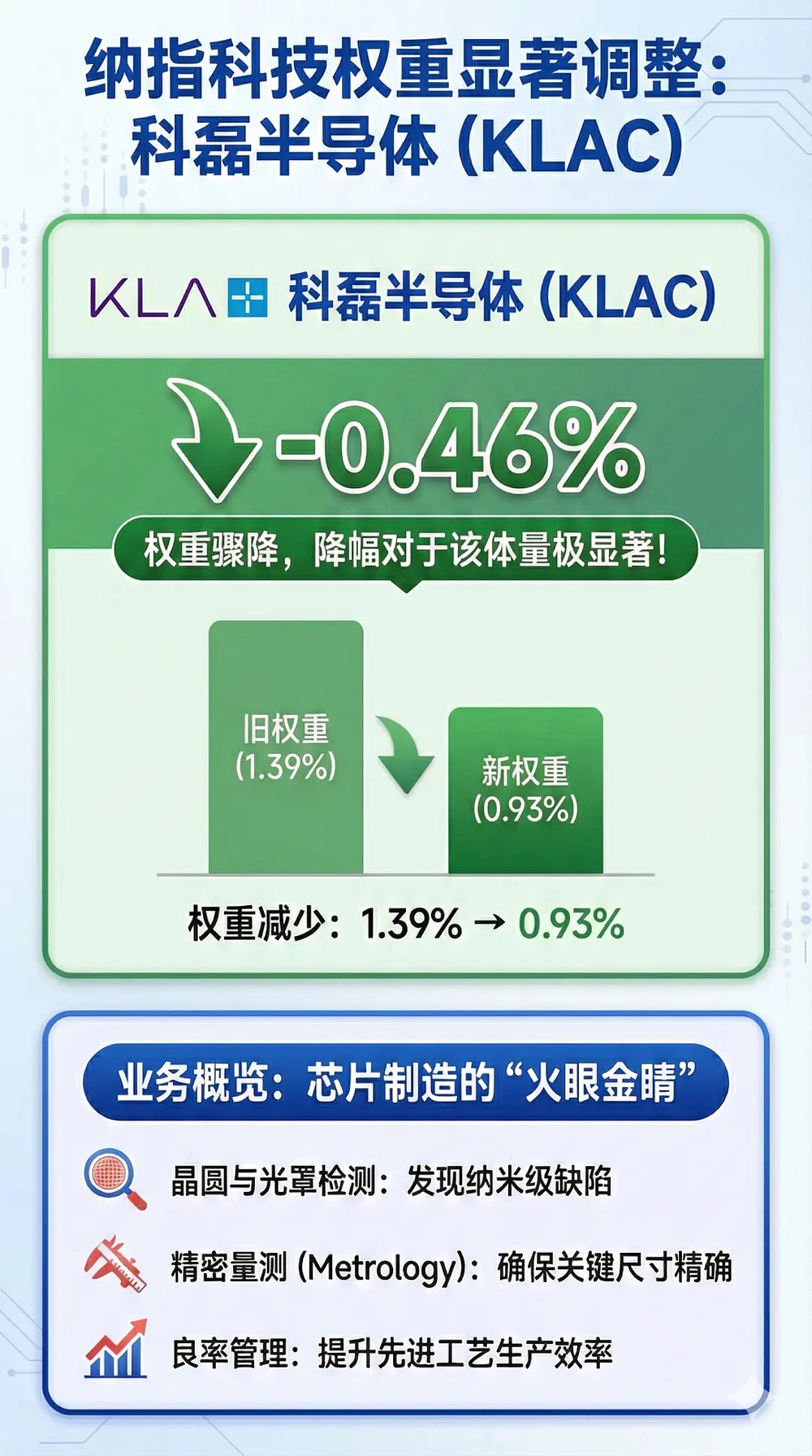 (5)科磊半导体:权重从 1.39% 骤降至 0.93%,降幅对于该体量的股票非常明显。