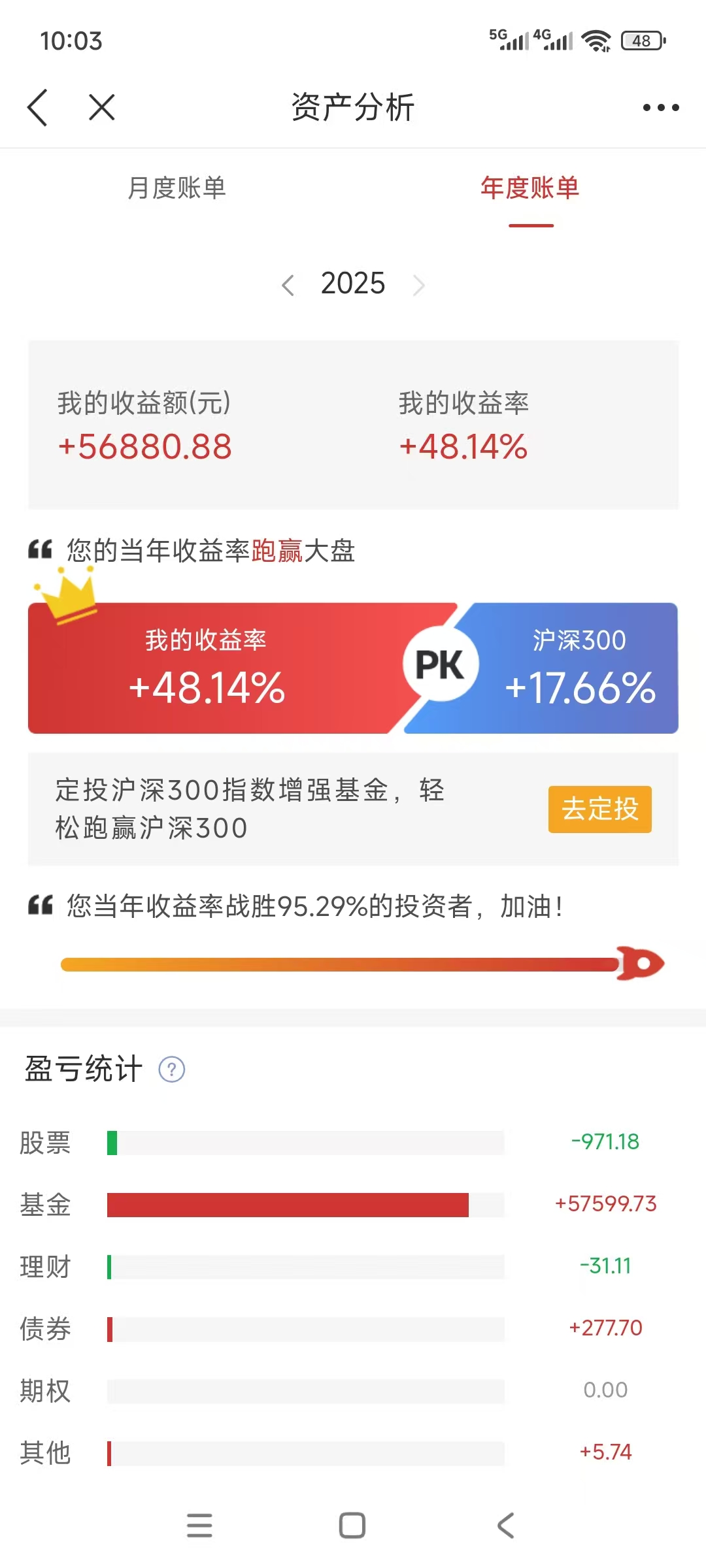 2025年:盈利56880.88元;收益率+48.14%。虽然自己的本金不大,挣的也不多,但相较往年,自己很满意。